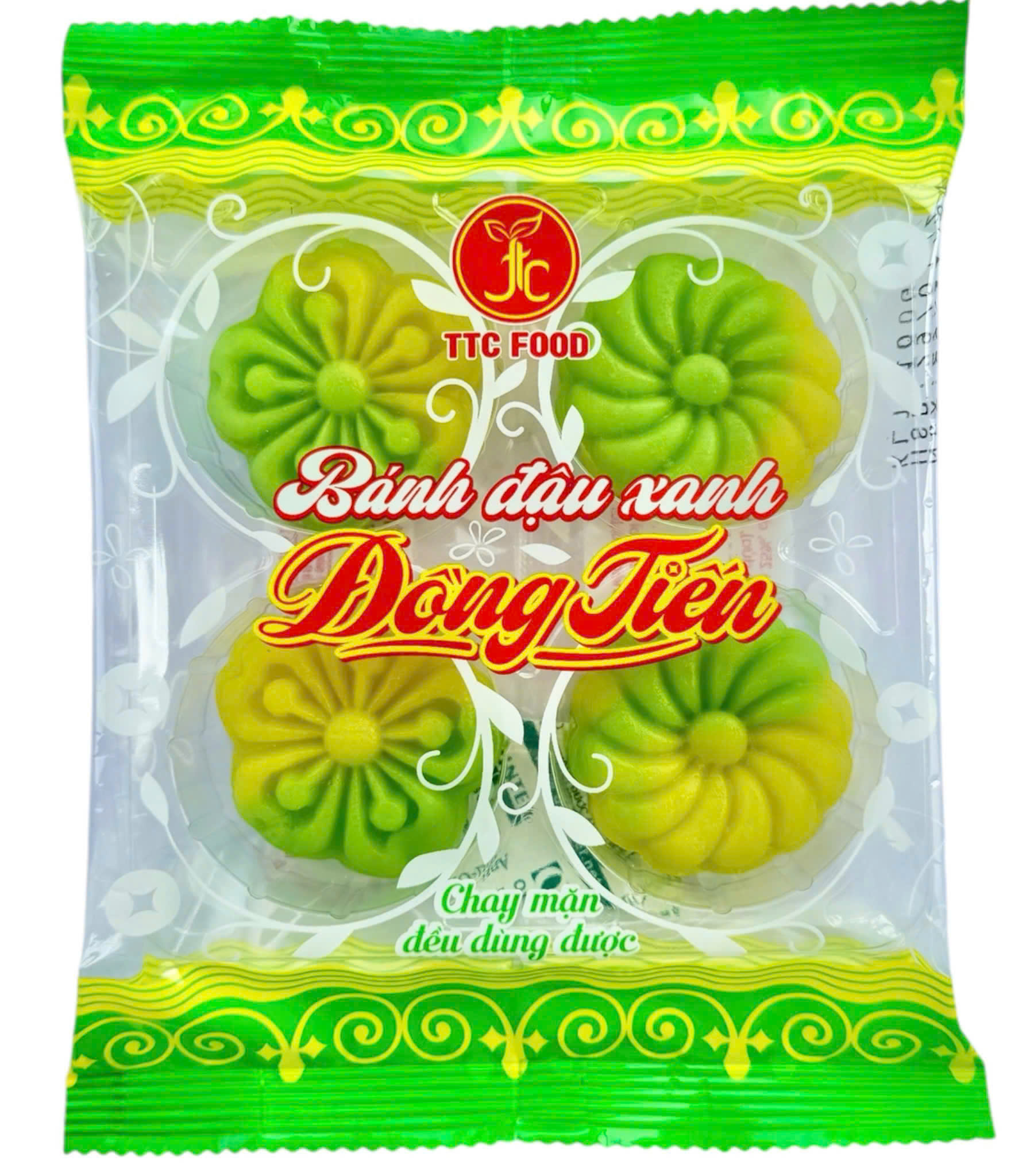 Dòng bánh đậu xanh Đồng Tiến 4 cái/ túi với hình ảnh chiếc bánh là bông hoa với sự kết hợp giữa 2 màu sắc: màu xanh từ lá dứa và màu vàng nguyên bản của đậu xanh thơm ngon, bùi béo nhưng không quá ngọt.