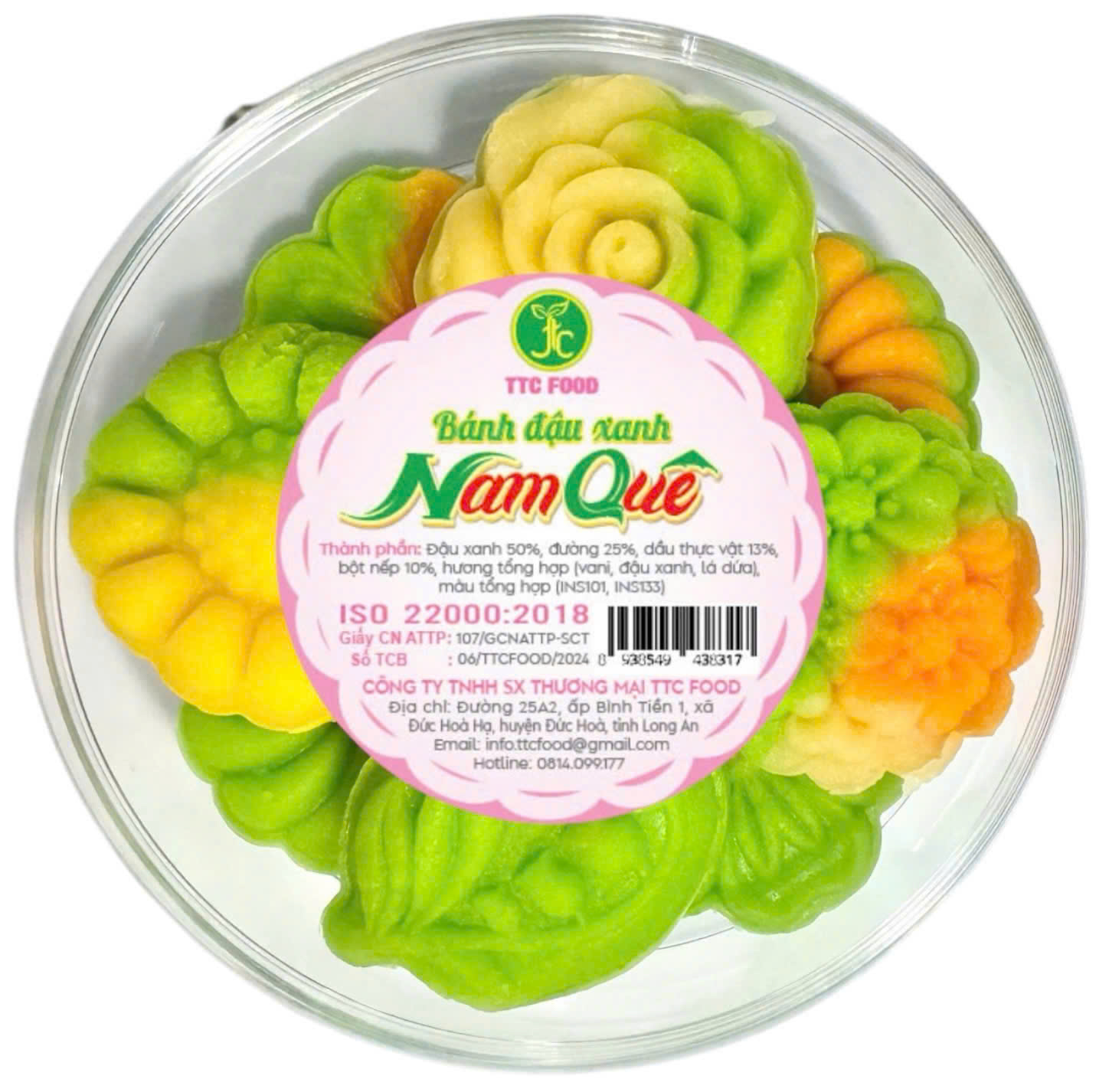 Dòng bánh đậu xanh Nam Quê với hình ảnh chiếc bánh là bông hoa với 2 màu sắc là màu xanh từ lá dứa và màu vàng nguyên bản của đậu xanh thơm ngon, bùi béo nhưng không quá ngọt.